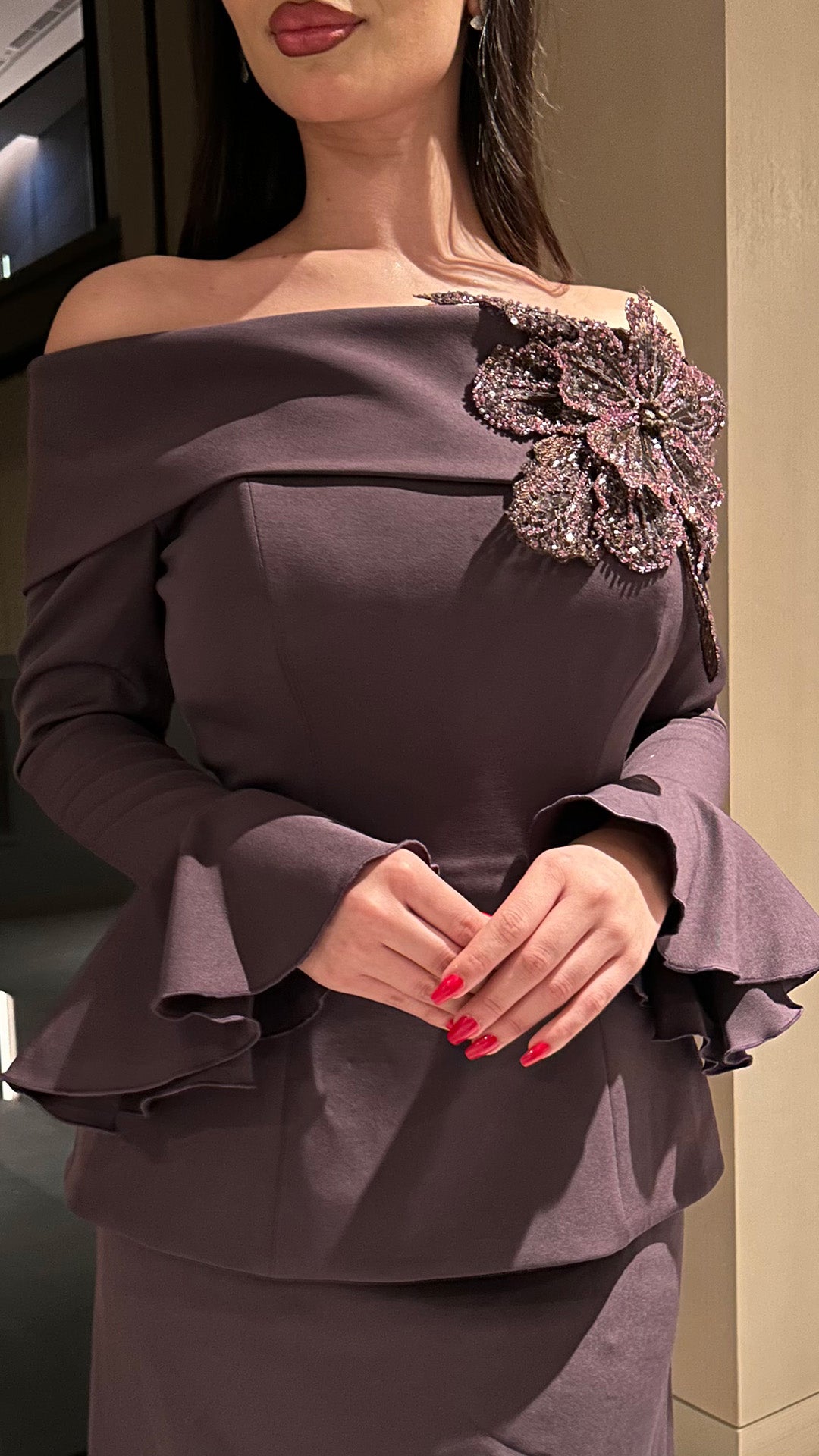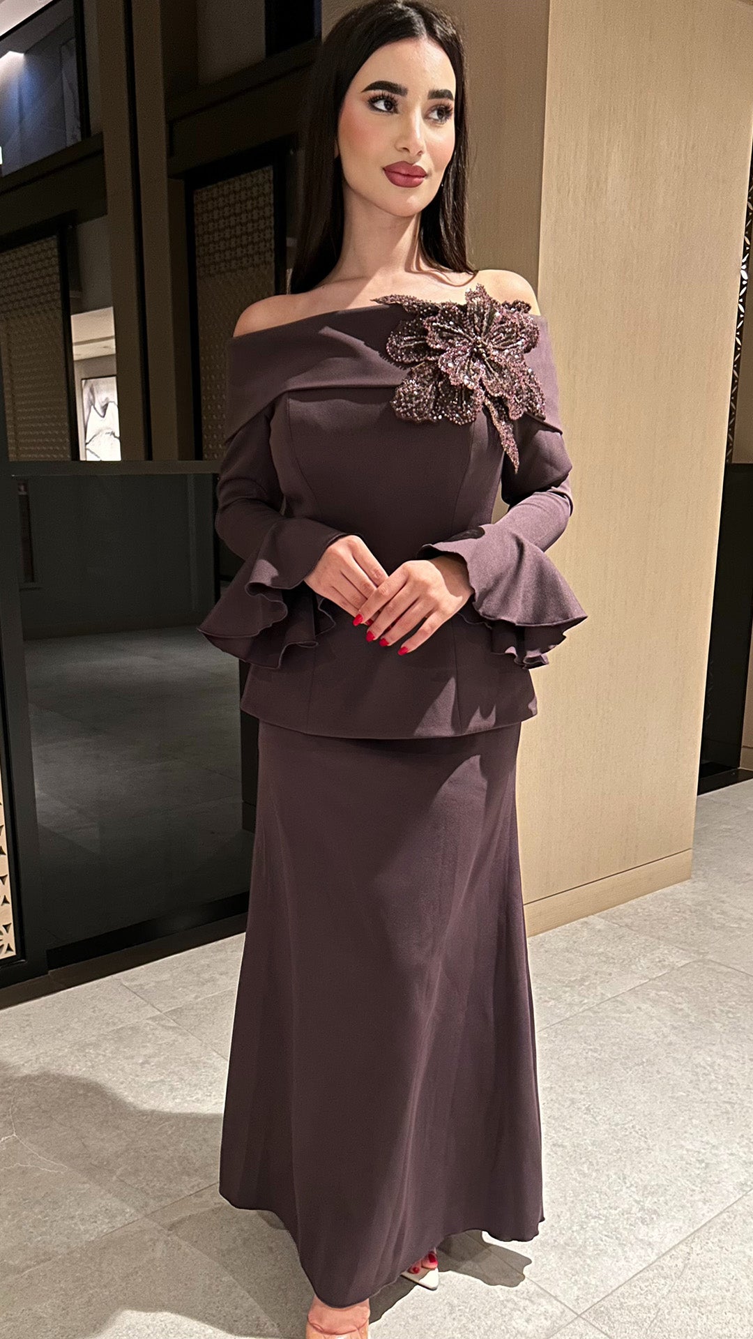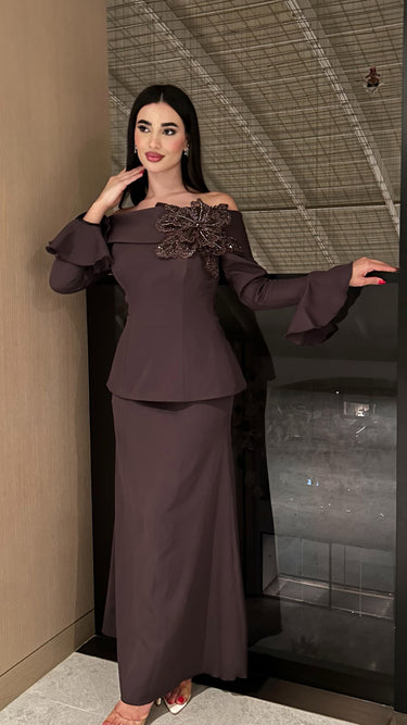 Crafted from exquisite crepe fabric, Cocoa Dusk features intricate hand-stitched floral embellishments that add a refined, artisanal touch. This combination ensures a luxurious texture and elegant appearance, perfect for those seeking sophisticated style with delicate craftsmanship.