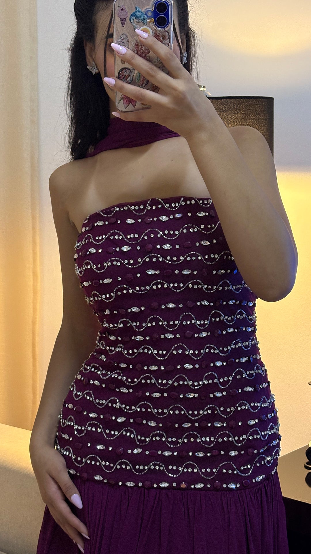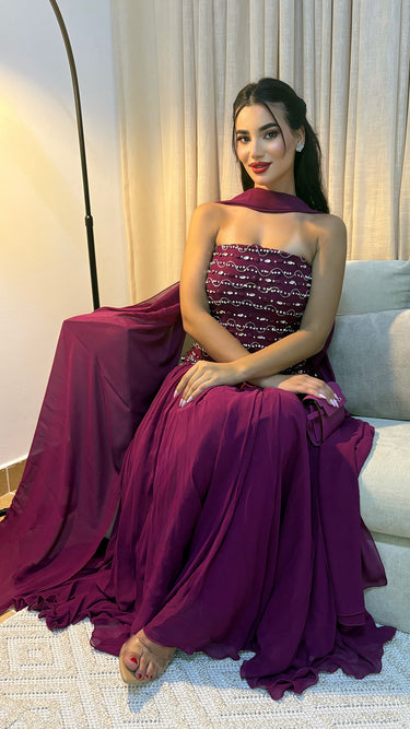 The Luna Bloom gown showcases an expertly crafted bodice adorned with shimmering crystals, creating a captivating focal point. Its flowing chiffon skirt is seamlessly integrated, offering elegant movement and a refined silhouette. A graceful neck scarf adds a contemporary, sophisticated accent, making this gown a perfect choice for those seeking timeless luxury with modern flair.