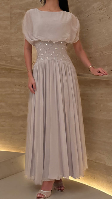 This floor-length gown combines elegance and romance with its delicate chiffon bodice and softly draped sleeves. The subtly embellished waistline, adorned with sparkling sequins, enhances the silhouette, while the flowing pleated skirt adds timeless movement and grace. Perfect for formal occasions, this dress offers a refined and sophisticated look.