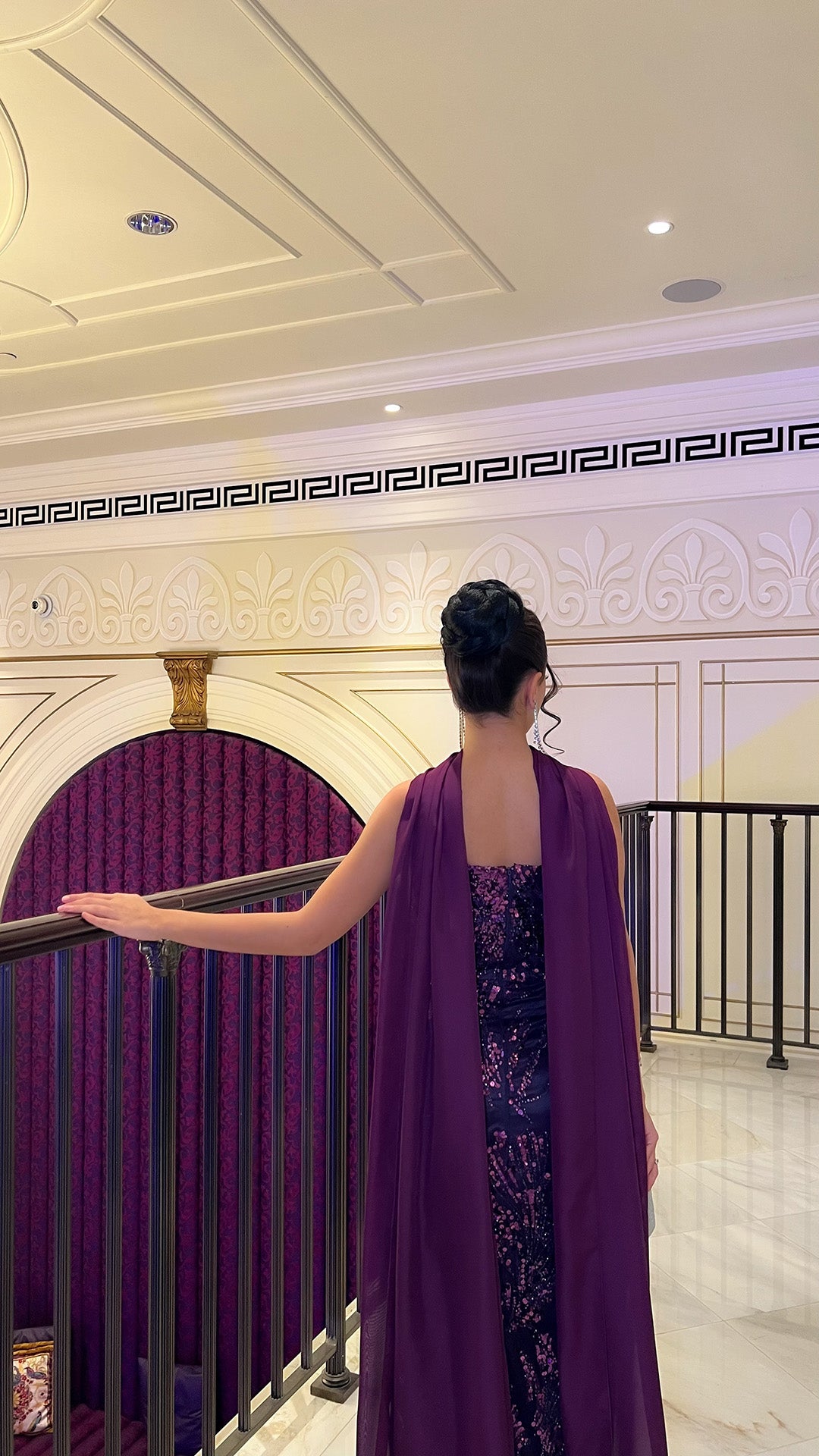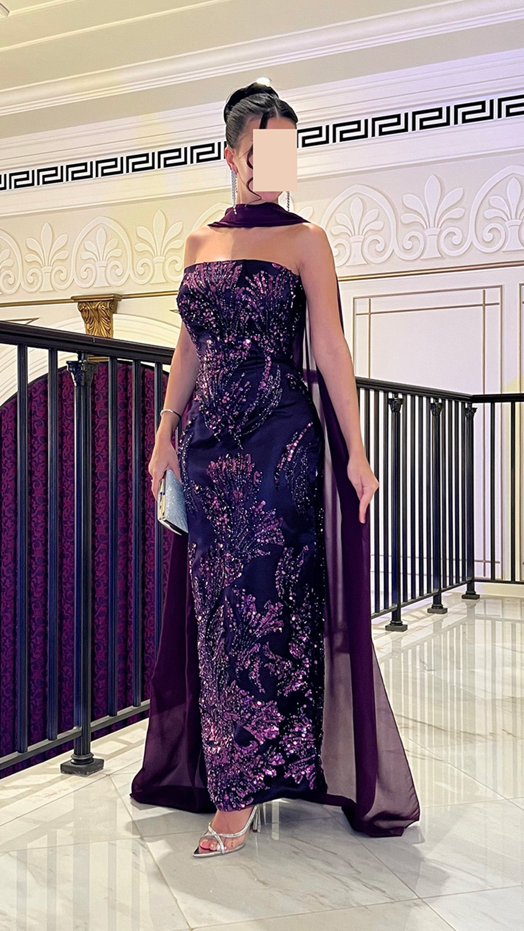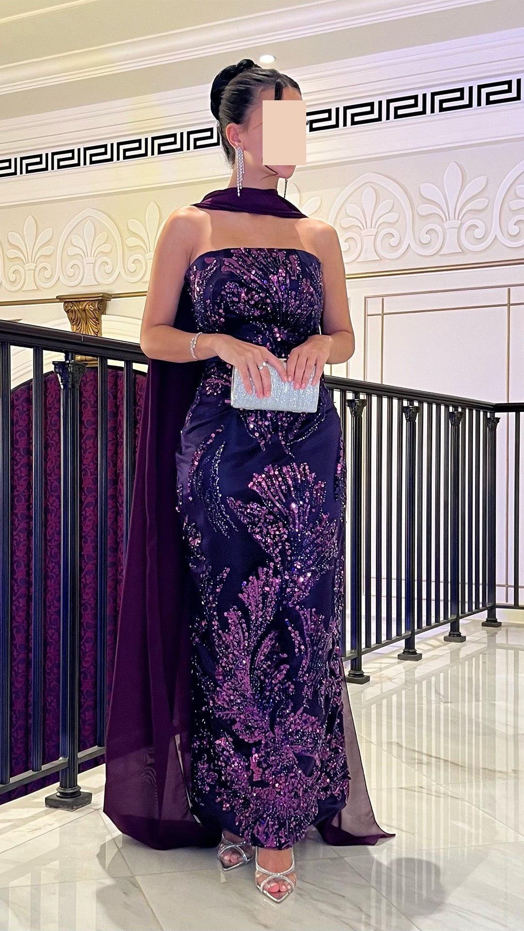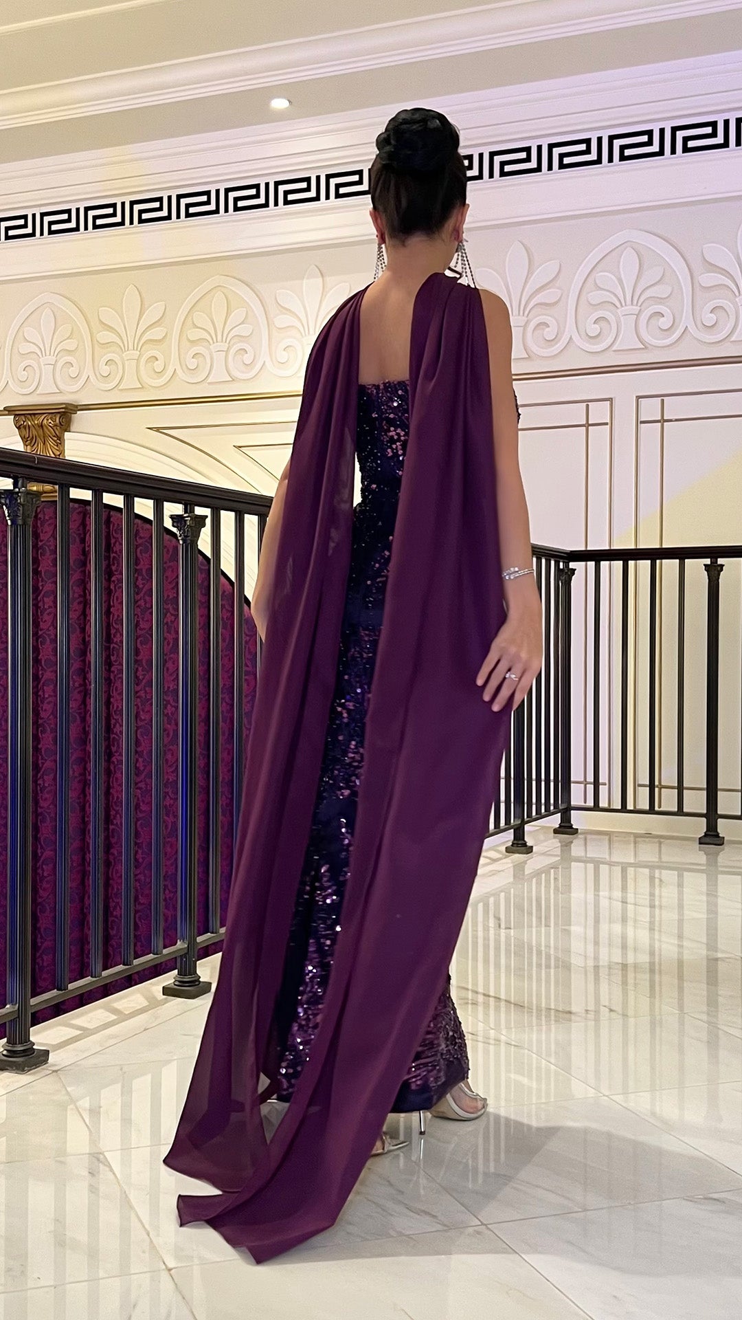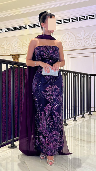 This elegant strapless gown in a rich deep plum hue features delicate sequin embellishments that catch the light with every movement. Paired with a flowing chiffon drape, it offers a graceful silhouette that combines sophistication with effortless glamour, perfect for making a memorable statement at any formal event.